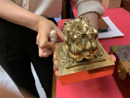 금고 안에서 보관함을 조심스레 꺼내면 봉황 두 마리가 무궁화 한 송이를 등에 얹은 모습을 한 국새가 드러난다. 한 손에 잡고 국새를 드는 순간 3.38㎏이나 되는 묵직한 무게감이 느껴졌다. 한 손으로 계속 들고 있기가 버거울 정도였다. 하루에 적게는 몇 십 장, 많게는 몇 백 장에 이르는 각종 임명장과 훈·포장을 숱하게 찍어내야 하기 때문에 붉게 바랜 탁자와 인주통이 국새실 한편을 채우고 있었다.