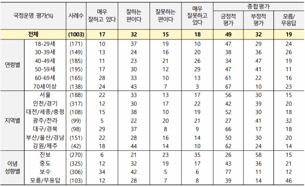 여론조사 전문업체 리얼미터가 20일∼24일 전국 성인 2515명에게 물은 결과(95% 신뢰수준 ±2.0%포인트), 윤석열이 ‘국정수행을 잘하고 있다’는 긍정 평가는 지난주 대비 1.4%포인트 하락한 46.6%, ‘국정수행을 못하고 있다’는 부정 평가는 지난주보다 2.3%포인트 상승한 47.7%.