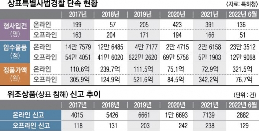 “지난해 상표권 침해사범 형사 입건이 557명이었고 8만점가량을 압수했다. 정품가액으로 보면 415억원 규모였다. 지난해 압수물품을 브랜드에 따라 나눠 보면 롤렉스 112억원, 샤넬 64억원, 루이비통 43억원, 까르띠에 41억원 순이었다. 해외 고가 명품이 대부분이지만 텀블러나 머그컵, 골프공 같은 소비자 수요가 많은 중저가 생활용품 관련 위조 상품도 있었다.”