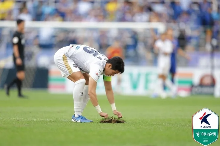 지난해 10월 6일 울산문수축구경기장에서 열린 K리그1 울산 HD와 김천 경기에서 김천 박승욱이 깊게 파인 잔디를 살펴보고 있다.  한국프로축구연맹 제공